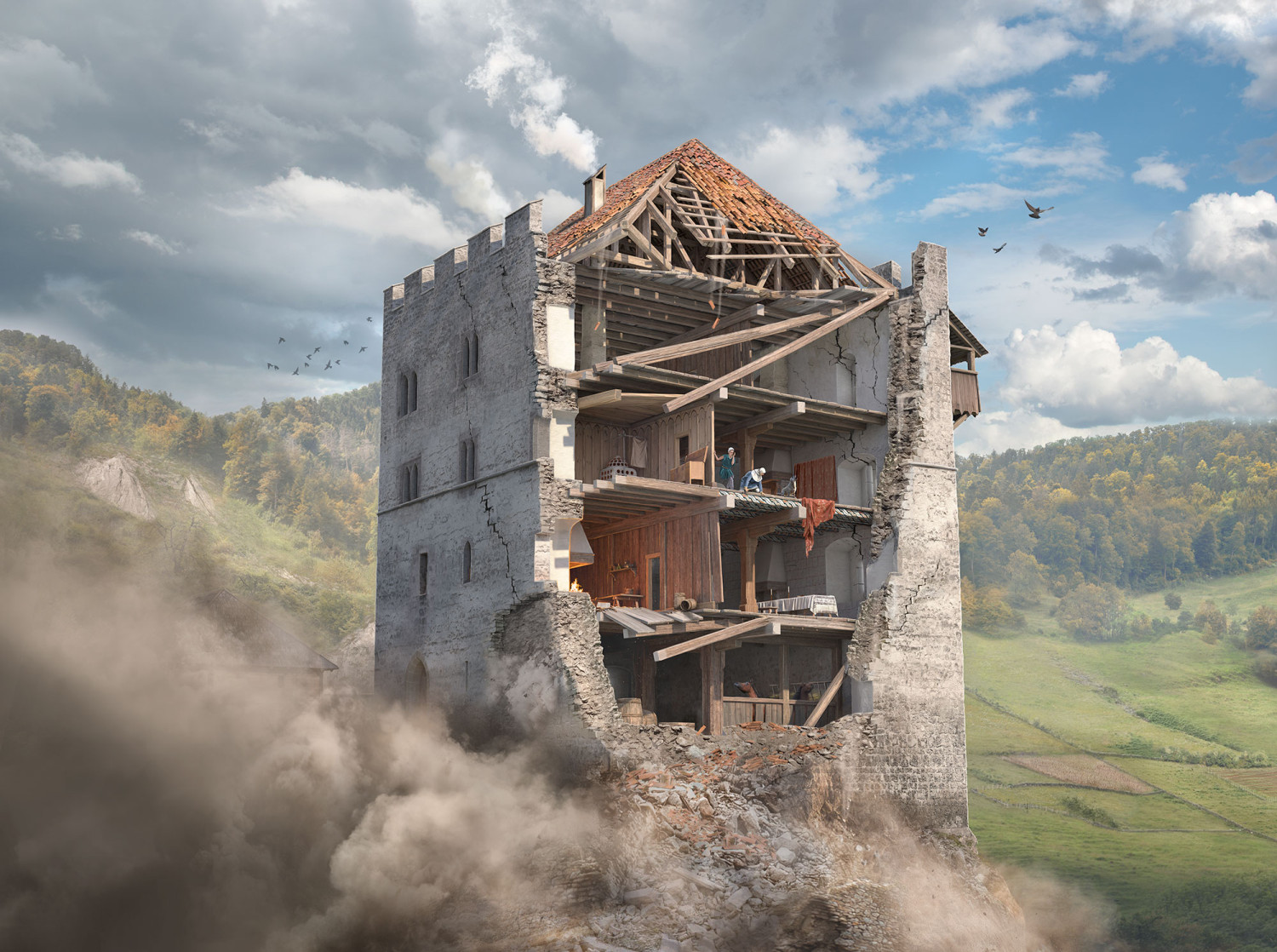 Das Lebensbild zeigt den Einsturz einer Fassade am Hauptturm beim Erdbeben von Basel um 1356.
